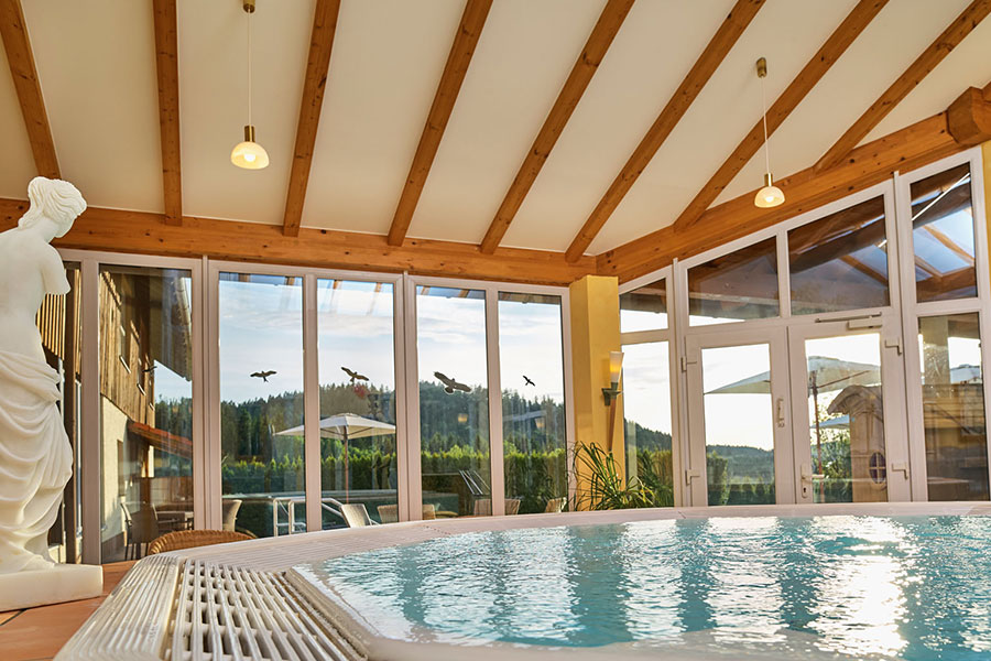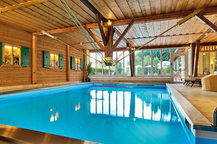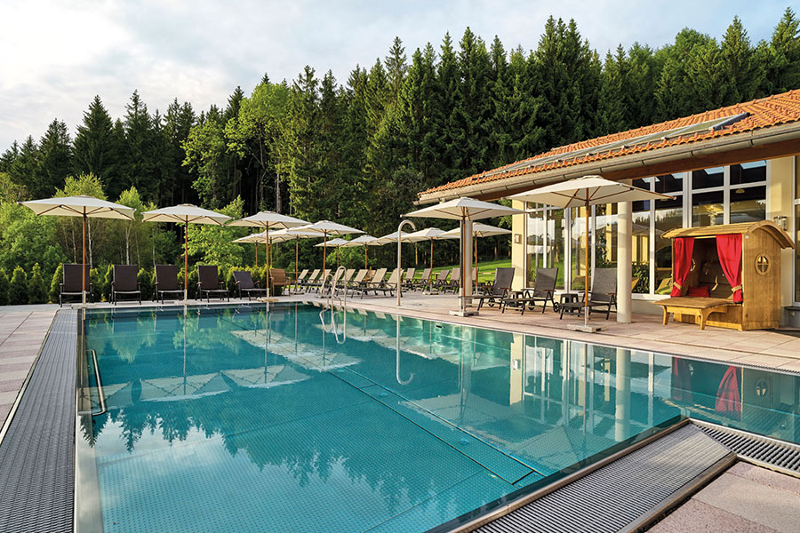 In der Bäder- und Saunawelt können Sie wunderbar entspannen und neue Kraft tanken. Der beheizte Außenpool in besonders schönem Ambiente ist ganzjährig nutzbar. Außerdem gibt es ein Hallenbad mit Gegenstromanlage und einen Whirlpool mit Wärmebank sowie großzügige Ruhebereiche mit verschiedenen Liegen und Relaxinseln.