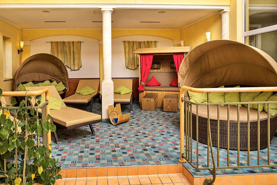 Im Saunabereich finden Sie verschiedene Saunen für jeden Geschmack, die 40 Grad warme Solesauna, die 60 Grad warme Bio Sauna und Kräutersauna, die 90 Grad warme finnische Sauna, bei 60 Grad in unserer Kräutersauna und die Infrarotsauna sowie die Ruheräume „Waldruhe“ mit Wasserbetten, „Fichtenruhe“ mit Schwebeliegen, „Eichenruhe“ mit Relaxliegen und den Panorama-Ruheraum mit Sternenhimmel. Anwendungen und Massagen sorgen für ein ganz besonderes Wohlbefinden.Die Highlights:
