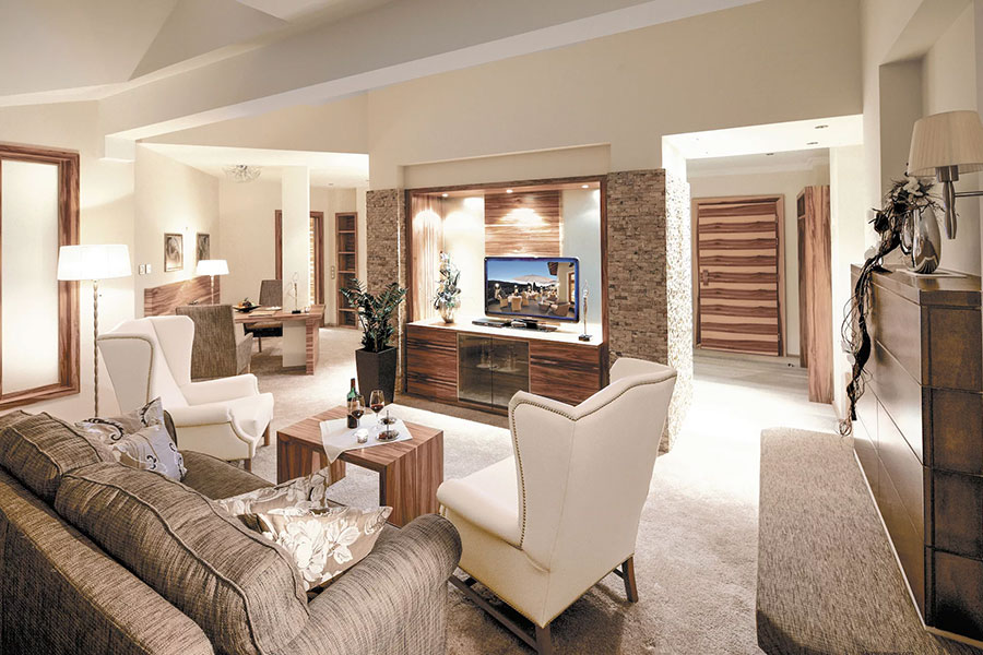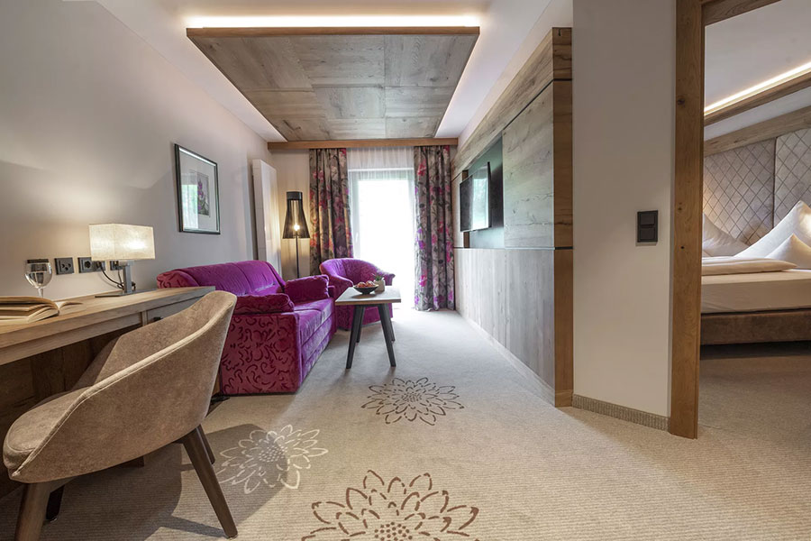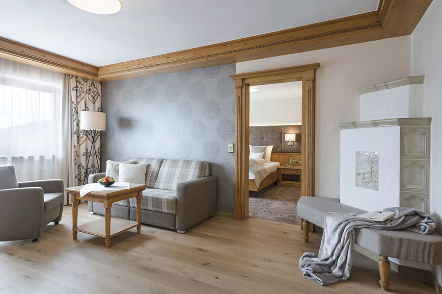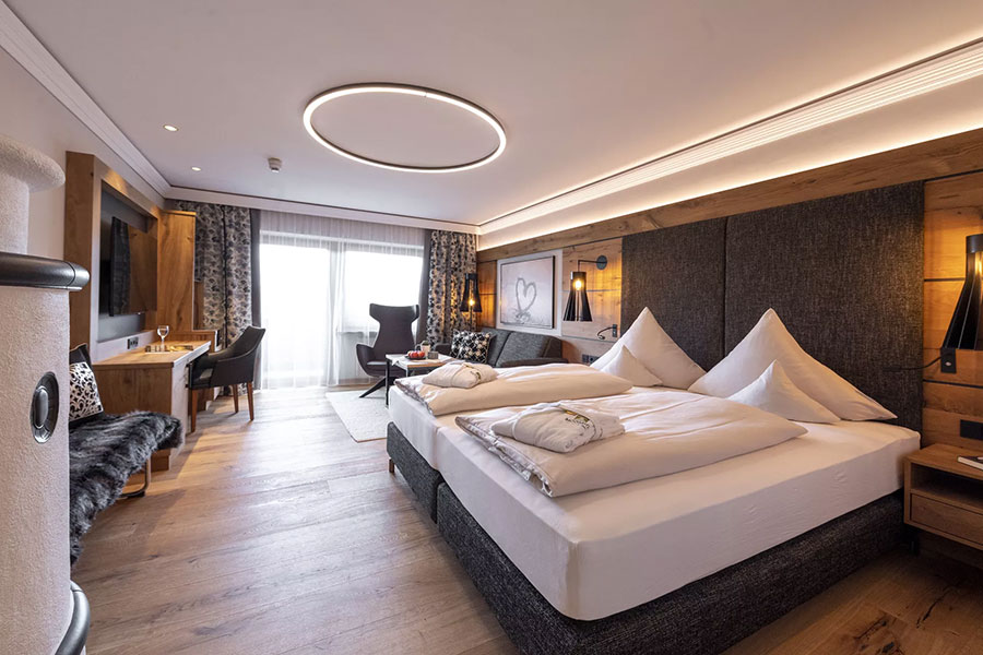 Die Gäste haben die Wahl aus komfortablen Doppelzimmern, Deluxe-Doppelzimmern mit Kachelofen und modernen Landhaussuiten. Im Sonnenflügel befinden sich die klassischen Suiten und die exklusiven Wellness- und Luxussuiten.