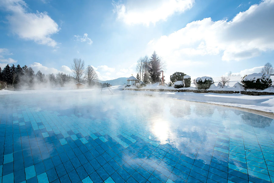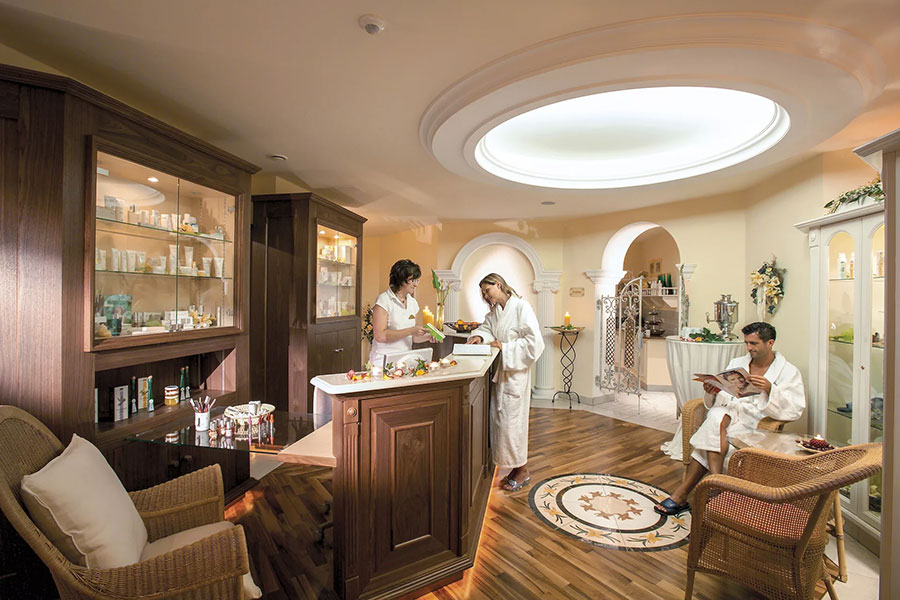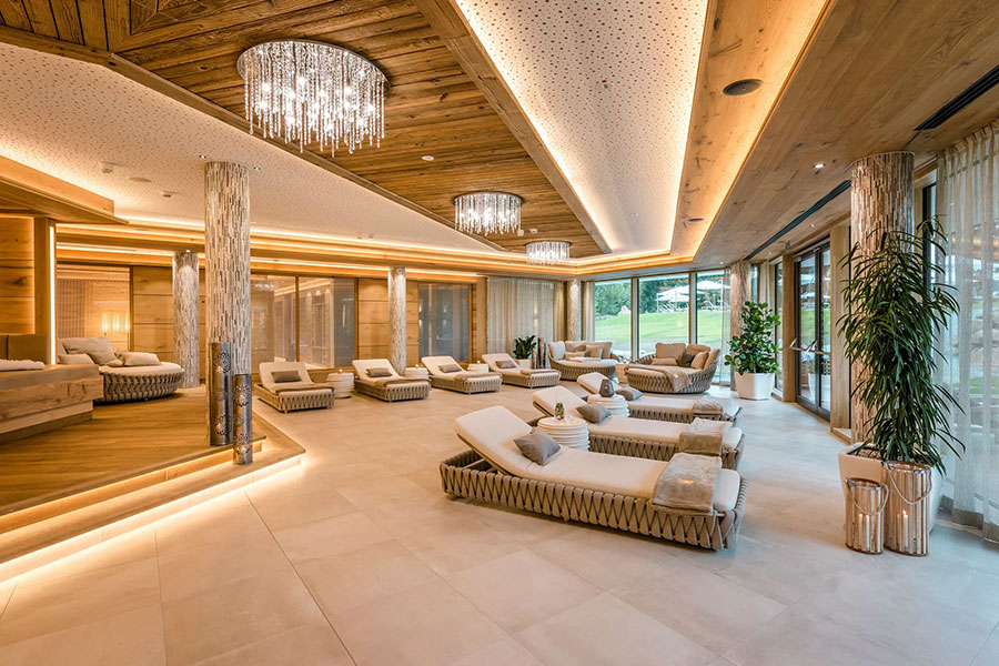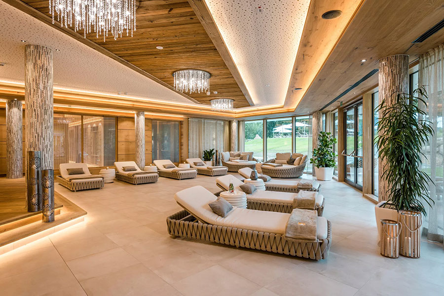 Der 5000qm große Wellness- und Spa-Bereich mit ganzjährig beheiztem Außenpool, Panoramaschwimmbad und verschiedenen Ruhebereichen, sowie der großzügige Saunalandschaft mit acht Themensaunen, Aroma-Dampfbad Außenwhirlpool und Kuschelnestern lädt ein zum Loslassen und Seele baumeln lassen. Die exklusive Private-Spa-Suite bietet Verwöhnprogramm der Luxusklasse. Sportbegeisterte kommen im Fitnessraum auf ihre Kosten.