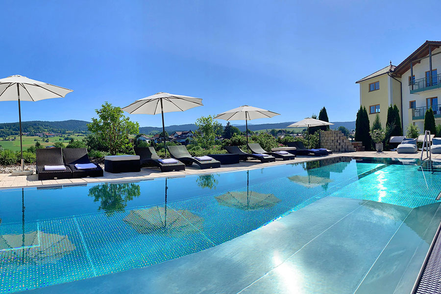 Die 3000 qm große Wellnesswelt ist vielfältig und offen zur Natur. Sie besteht aus Badelandschaft mit Panorama-Hallenbad, Kneippbecken und Liegewiese sowie ganzjährig beheiztem Außenpool mit Whirlliegen.