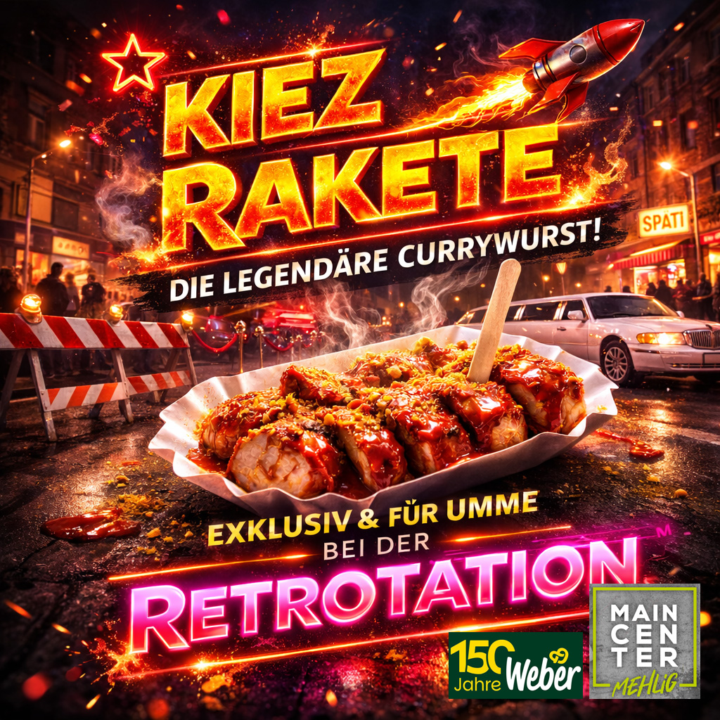 Zum 25-jährigen Jubiläum zünden wir eine echte kulinarische Premiere. Die „Kiez Rakete“ wurde eigens für diesen Abend entwickelt und feiert ihre allererste Ausgabe bei der Retrotation im Zauberberg – exklusiv und nur für diese Nacht. Die spezielle Currywurstsoße wurde von Daniela mit viel Leidenschaft, Kreativität und dem richtigen Gespür für Geschmack ausgetüftelt. Die Wurst stammt von Maincenter Mehlig in Veitshöchheim, das passende Brötchen kommt vom Weber Smart Shop – starke Partner aus der Region, die dieses Jubiläum mit Qualität begleiten. Herzhaft, würzig und mit genau dem richtigen Kick. Die Kiez Rakete gibt es an diesem Abend gratis – solange der Vorrat reicht – und sie steht sinnbildlich für 25 Jahre Main Magazin: regional, besonders und mit Liebe zum Detail gemacht.