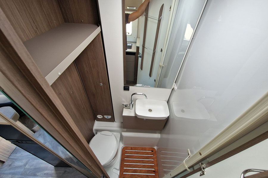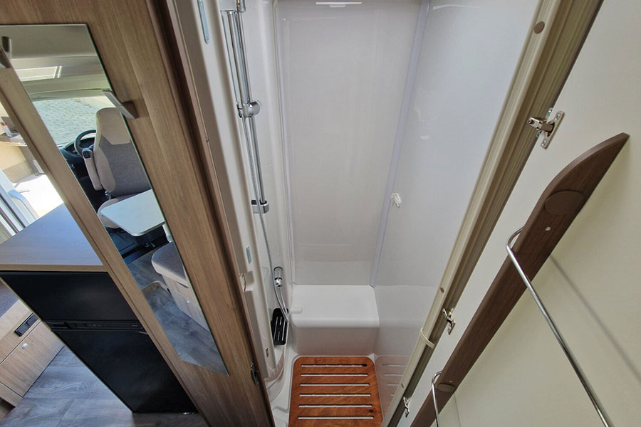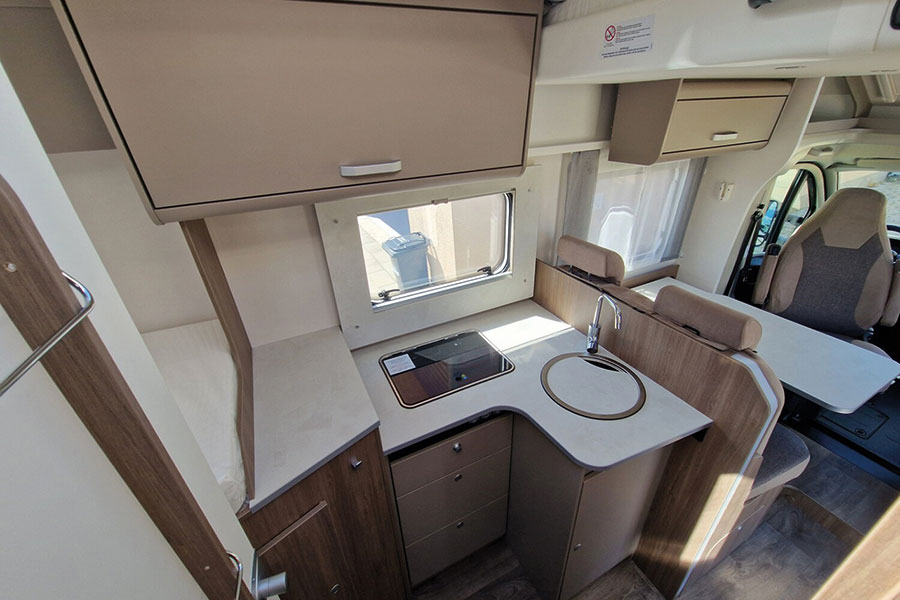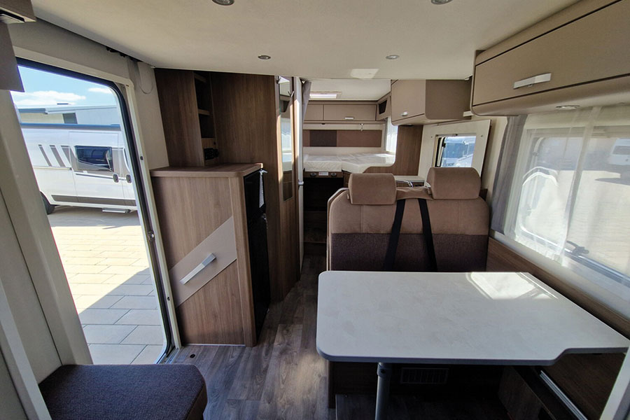 Wer den Carado T 338 betritt, merkt schnell, dass hier jedes Detail auf Komfort ausgelegt ist. Im Heck befinden sich komfortable Längseinzelbetten, die sich zu einer großen Liegefläche verbinden lassen. Optional sorgt ein Hubbett für zusätzliche Schlafplätze, sodass bis zu vier Personen bequem reisen können. Diese Flexibilität macht das Fahrzeug sowohl für Paare als auch für Familien besonders attraktiv.