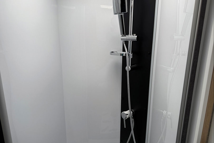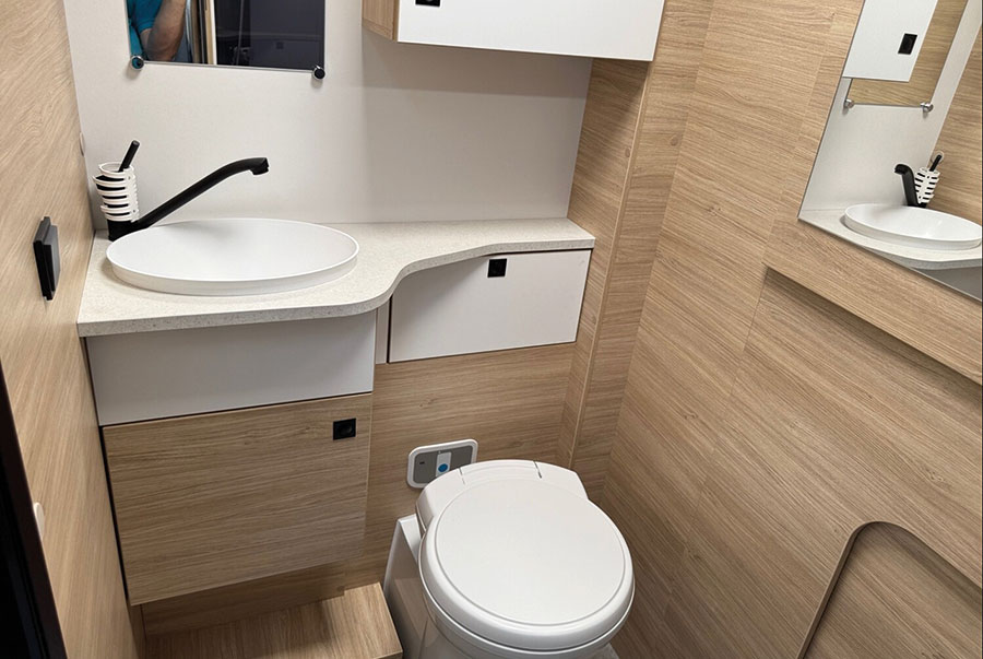 Das Schlafkonzept überzeugt auf ganzer Linie: Ein komfortables Hubbett (160 × 190 cm) lässt sich elektrisch absenken, während die Dinette mit wenigen Handgriffen in ein zweites Bett (190 × 130 cm) verwandelt werden kann. So bietet das Fahrzeug bequem Platz für zwei bis vier Personen – ideal für Paare, kleine Familien oder Freunde auf Tour. Das Verdunklungssystem im Fahrerhaus sorgt dabei für angenehme Ruhe und Privatsphäre. Auch das Bad ist ein echtes Plus: Im Heck wartet eine separate Duschkabine, eine Cassetten-Toilette und ein Waschbereich mit ausreichend Platz für Pflegeartikel. Durch die klare Raumaufteilung entsteht ein echter Wellnessbereich auf kleinstem Raum – praktisch, sauber und komfortabel.