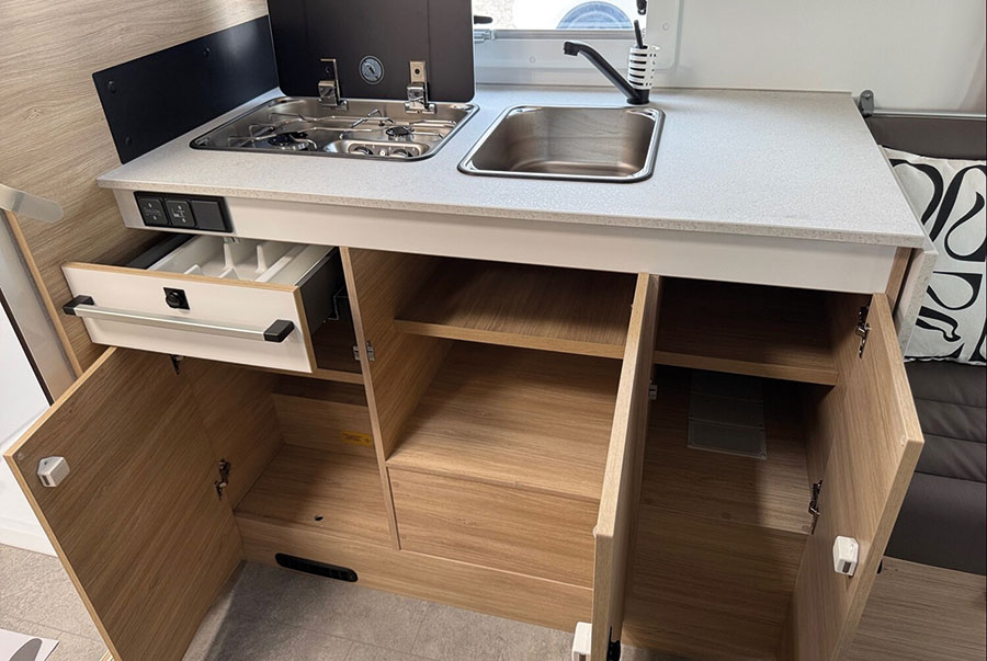 Im Mittelpunkt steht die große Küche: Zwei-Flammen-Gaskocher, geräumiger Kühlschrank mit Gefrierfach und reichlich Stauraum für Geschirr, Vorräte und Kochutensilien sorgen dafür, dass auch unterwegs echtes Kochvergnügen aufkommt. Die Arbeitsflächen sind robust und funktional, und dank der durchdachten Beleuchtung hat man auch abends immer den richtigen Überblick.
