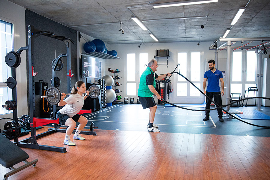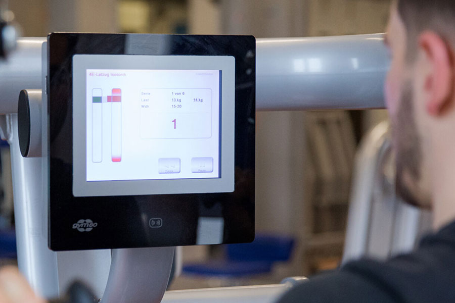 Nach einer sporttherapeutischen Eingangsuntersuchung erstellt das erfahrene Team aus Sportwissenschaftlern und Sporttherapeuten einen persönlichen Trainingsplan. Dieser wird regelmäßig dokumentiert und angepasst. Trainiert wird an modernen computergesteuerten Geräten, ergänzt durch Functional-Training und Ausdauerübungen auf neuen Ergometern. Alle Systeme sind per Chipkarte konfigurierbar – komfortabel und effizient.