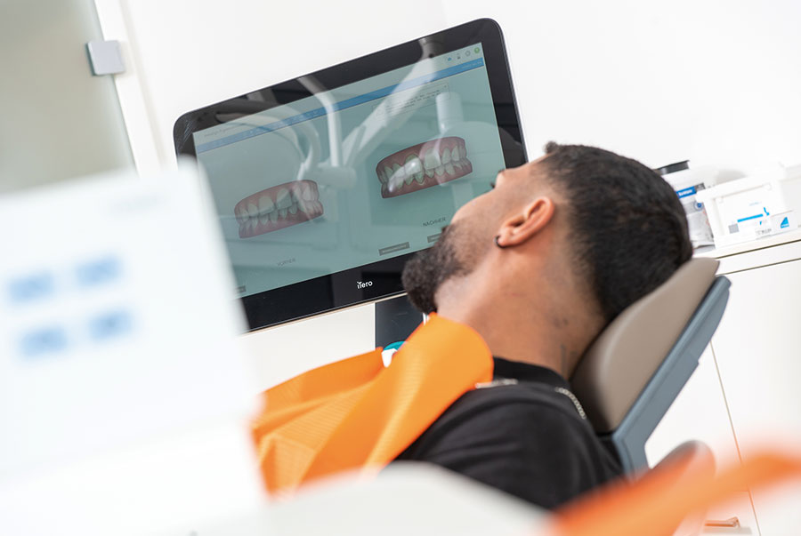 Bereits vor Behandlungsbeginn wird das gewünschte Ergebnis anhand eines präzisen 3D-Scans digital geplant. Unangenehme Abdrucklöffel gehören damit der Vergangenheit an. Die Praxis Zahn & Ästhetik nutzt seit vielen Jahren modernste Scan-Technologien, um hochpräzise und komfortable digitale Modelle zu erstellen, die als Basis für den individuellen Behandlungsplan dienen. Anhand dieser Daten wird ein persönliches Set aus Alignern angefertigt. Die erste Schiene wird direkt vor Ort eingesetzt, weitere Exemplare erhält der Patient mit nach Hause. Etwa alle sechs bis acht Wochen erfolgt eine Kontrolle des Fortschritts – so lässt sich die Zahnstellung Schritt für Schritt optimieren. Auf diese Weise entsteht ein natürlich schönes Ergebnis, das nicht nur ästhetisch überzeugt, sondern auch die Funktion und Gesundheit der Zähne langfristig unterstützt.